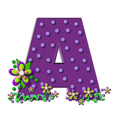 A, "Clinging Vine" alfabesindeki üç katmanlı mod çiçeklerle süslenmiştir. Harfler mor, üzümler ve yapraklar nane yeşilidir..