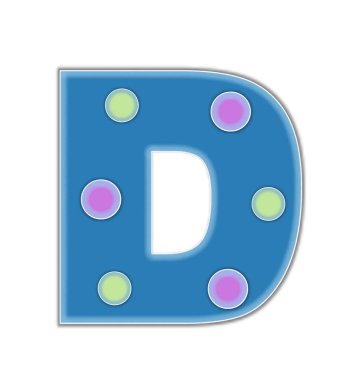 Alfabe seti "Mor ve Noktalar" daki D, beyazla çizilmiş mordur. Mektup iki tonlu yuvarlak noktalarla süslenmiş..