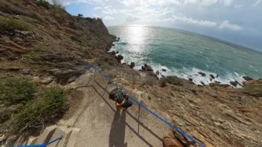 Bir adam uçurumun kenarındaki bir çitten denize doğru tırmanıyor. Sahildeki bir uçurumun tepesindeki çimenli bir parkın manzaralı geniş açılı görüntüsü, denize bakıyor. Parlak güneş ve geniş okyanus ufku barışçıl ve güzel bir doğal manzara yaratır..