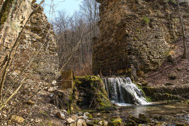 Taş köprü - bir değirmenin parçası. Hızlı bir nehrin akışı değirmen tekerine aktı. Su çarkı ve ormandaki eski değirmen..