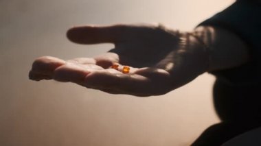 Açık Mavi Şişe 'den Beyaz Kapsül Seçen Bir Adam Pürüzsüz Yüzeyi ve Besleyici İlacın Hassas Şeklini Gösteriyor