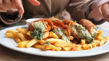 Lezzetli balık ve patates kızartması beyaz tabakta soslu ve limonlu siyah bir masada servis ediliyor.