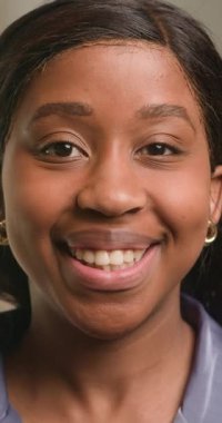 Genç Afrikalı Amerikalı bir kadının objektif bir ifadeyle kameraya bakışının yakın plan portresi.