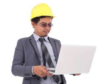 Genç mimar beyaz kask takıyor, oturuyor ve tabletle çalışıyor. Beyaz arka planda izole edilmiş. Güvenlik ekipmanları.