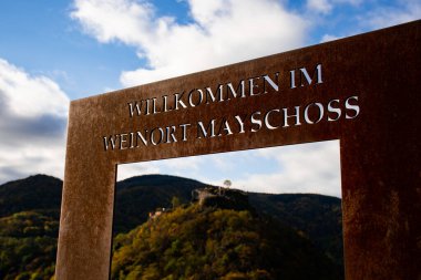 Balzers, Lihtenştayn - 16 Ağustos 2024: Liechtenstein Prensliği armasını gösteren sınır işareti, arka planda tepeler olan yeşil bir manzaraya karşı kurulmuş.