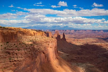 Utah 'ta Moab yakınlarındaki Canyonlands Ulusal Parkı' nın Gök Bölgesi 'nde gün doğumunda dramatik bir kanyon kaya oluşumu meydana geldi.