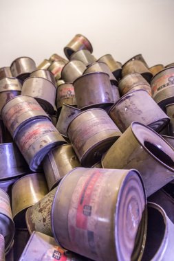 Tozlu film makaraları arşiv odasındaki ahşap raflarda düzenli olarak düzenlenir. Eski makaralar, bazıları metal kutularda, tarihi sinema hazineleri barındırıyor gibi görünüyor..
