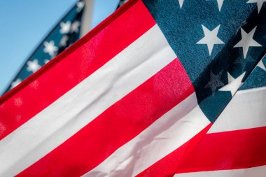Küçük Amerikan bayraklarını şehirdeki geçit töreninde bir binaya ve gökyüzüne sallarken görüntüsü