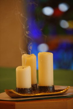 Yanan palo santo sopası, değerli taş ve yanan mumlar, yakın plan.