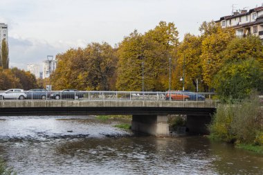 Torino, İtalya - 09 Kasım 2021: Ponte mobil Domenico Carpanini, beyaz çelik yapıya sahip modern bir yaya köprüsü, sonbahar yaprakları boyunca uzanan bir nehir..