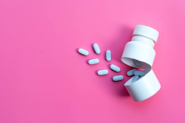 Pembe arka planda kavanozda bir sürü beyaz hap ve uyuşturucu var. Sağlık sigortası konsepti. Metin için boşluk.
