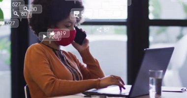 Sosyal medya bağlantısı için animasyon ölçümleri sergilerken dizüstü bilgisayarda ve telefonda yazan bir kadın. İşbirliği, dijital, üretkenlik, modern, analitik, iletişim, yenilik