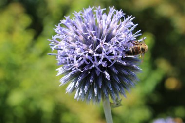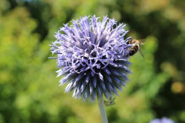 Güzel bal arısı parlak ve gösterişli Allium Giganteum çiçeklerinden nektar çıkarıyor. Canlı dev allium çiçekleri topları. Yaygın adı Çiçekli Soğan