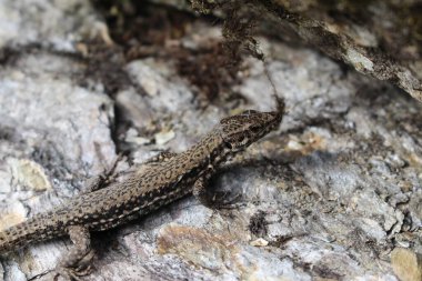 Dişi Çayır Kertenkelesi ağaç kabuğuna karşı kamufle oluyor.