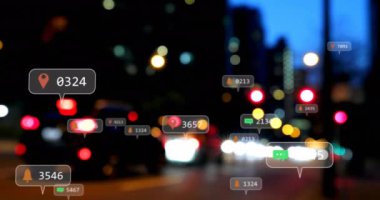 Arka farların sönmesi, çarpışma için kameraya yaklaşan araçların bildiri simgelerini tetikler. Kentsel, geleceksel, teknoloji, dijital, hareket, canlı, dinamik