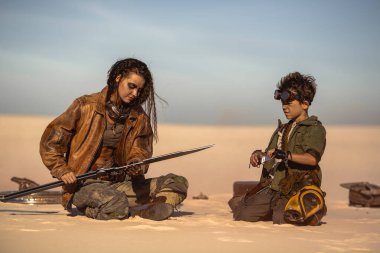 Kıyamet sonrası engebeli engebeli bir kadın savaşçı ufku dürbünle tarıyor, çölde hayatta kalma ekipmanları arasında oturuyor, bilim kurgu ya da distopist kavramlar için mükemmel..