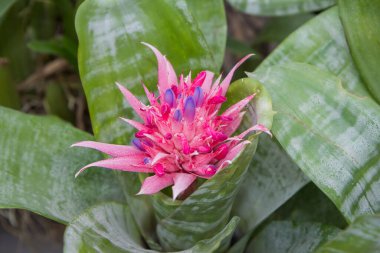 Parlak pembe tropikal Aechmea Fasciata Baker yeşil yapraklar üzerinde çiçek açan yaz arkaplanı