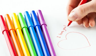 Renkli kalemler eğik bir eğimle uyumlu renkli kalplerle hizalanır. Eğitim için yaratıcı konsept, LGBTQ + gurur, sanat ve duygusal ifade.