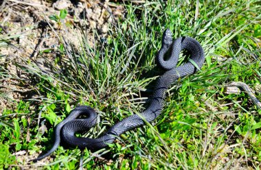 Çam ormanında yerde yılan kuru otlar ve iğnelerle