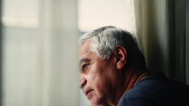Yaşlı adam iki eliyle ağzının önünde başını eğiyor, ofiste yalnız kaldığı süre boyunca derin duygular ve tefekkür gösteriyor.