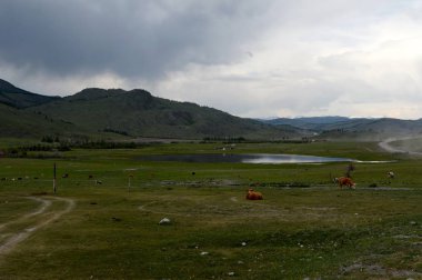 Dağ yeşili manzara. Ufuktaki ilk çimenlikte, karla kaplı dağları sersemleten doğa. Yüksek kalite fotoğraf