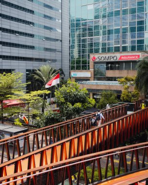 Palembang 'taki Ampera Köprüsü sokak yemeği bisikleti ve manzaranın tadını çıkaran insanlar.