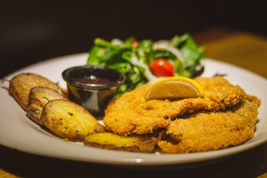 Beyaz tabakta servis edilen taze yeşil salata üzerine kızarmış tavuk şeritleri..