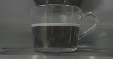 Siyah kafe tezgahında sıcak kahve yapmak için bardağa sıcak su döken biri.