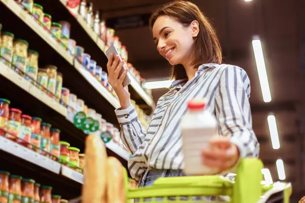 "Gülümseyen Kadın Yerel Dükkanda dururken Akıllı Telefon Kullanıyor". Cep telefonuyla internette sörf yapan neşeli bayan, düşük açılı alışveriş yaparken mesajlaşıyor ve mesajlaşıyor.