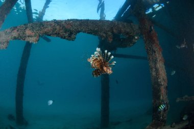 Denizde batık bir yapının yanına dalan dalgıç, sualtı dalışı ve su altı macerası kavramı, metin alanı için kopyalama alanı
