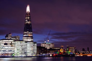 LONDON, UNITED KINGDOM - 1 Ocak 2018 Londra 'nın Çömlek Parçası ile aydınlanmış silueti ve dramatik akşam bulutları altında Thames Nehri' nin yansımaları. Yüksek kalite fotoğraf