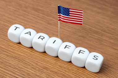 ABD bayrağı ve Tariff 'in ulusal bayrağını salladığına dair sarı uyarı bandı. ABD hükümetinin yeni ticaret politikası.