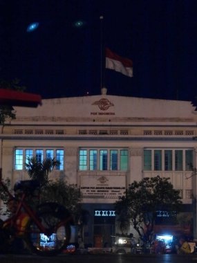 Motosiklet, Yogyakarta, Endonezya, 12 Ağustos 2108 'deki Avrupa tarzı tarihi binalardan geçiyor. Yogyakarta hala tarih değerlerini koruyan bir kültür şehri olarak bilinir..