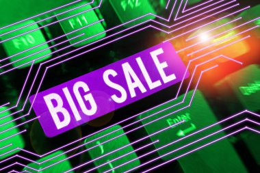 Veritabanı koridorunda raflar, B daireleri, neon üçgen ve yarım tonlu FLASH satış pankartı gösteriliyor. Teknoloji, veri, dijital, ağ, gelecek, yenilik, siber güvenlik