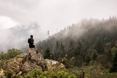 Desierto de los Leones, Meksika 'daki sisli bir ormana bakan tanınmayan bir erkek yürüyüşçünün arka görüntüsü.