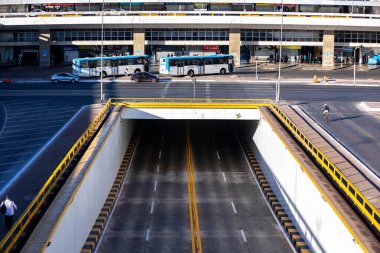 Ses bariyerleriyle çevrili ve yüksek binalarla çevrili kıvrımlı bir şehir yolu.