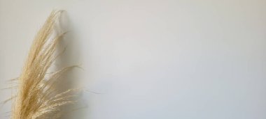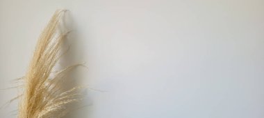 Beyaz pofuduk kabarık çiçeklerin kuru dalı bej arka planda, düz yerde. Metin ve pankart için boşluk.