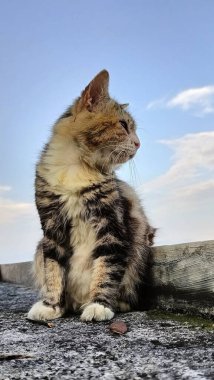 Close-Up of Cat on Rooftop Under Sky. A Cat Moment of Reflection.