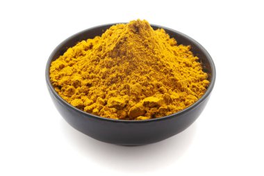 Siyah arka plandaki kasede zerdeçal tozu, üst manzara. Aromatik baharat