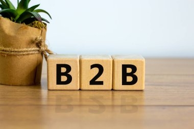 Kısaltma adı B2B-İş 'ten İş' e. B2B metni ile el ele tutuşan tahta küp bloğu. İş Konsepti resmi.