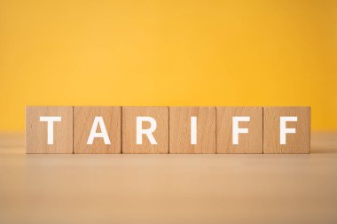 Kopya alanı ve kırpma yolu ile beyaz arkaplanda izole edilmiş TARIFF metin ile tahta bloklar. Gümrük ve Ticaret Savaşı Konsepti. Küresel Ekonomi ve İthalat Vergisi.