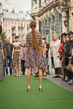 Moda haftası boyunca IFERMA 'da Latin Amerika tasarımı giyen bir model podyumda yürüyor. 9 Mayıs 2025 İspanya