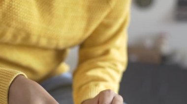 Güler yüzlü çift, evde sessiz sakin konuşurken sevgi dolu sözlerle şefkat gösterirler. Boş saatler nazik sevgi ve derin bağlarla doludur. Dikey video.