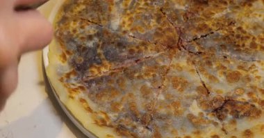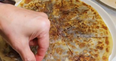 Yakın plan kesim kremalı turta ve yaban mersinli pasta. Bıçakla, yakın plan çekimle. Malzeme tarifi aşçılığı. Ev yapımı yemek fırını. Tatlı hazırlıyorum.