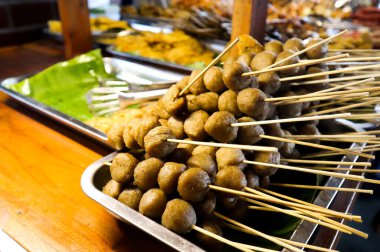 Ahşap şişler üzerindeki tuzlu köfteler hareketli bir sokak yiyecek pazarında cızırdıyor. Etrafı otlar ve baharatlarla çevrili. Akşam havasında nefis bir koku yaratıyor..