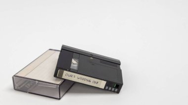 Beyaz arka planda üst üste dizilmiş iki miniDV video kaseti. En üstteki kasette "Eski Düğünümüz" yazıyor. Kasetler siyah ve gri. Görüntü iyi aydınlatılmış ve odak noktası keskin. Genel havası nostaljik ve remini.