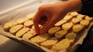 Ev Mutfağında Bir Kadın İkinci Fırında Pişirmeden Önce Cantucci Bisküvilerini Keser.