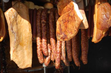 Etlerin çeşitli çeşitleri zarif bir şekilde sergileniyor, sağlam bir askıda asılı, farklı türde sosislerle birlikte lezzetli jambonlar da var.