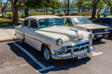 Havana, Küba 'da klasik Amerikan arabası. Renkli binalar ve eski arabalarla tipik Havana şehir manzarası