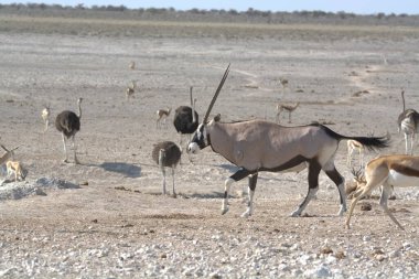 Gemsbok sürüsü bir su birikintisine yaklaşıyor, etosha